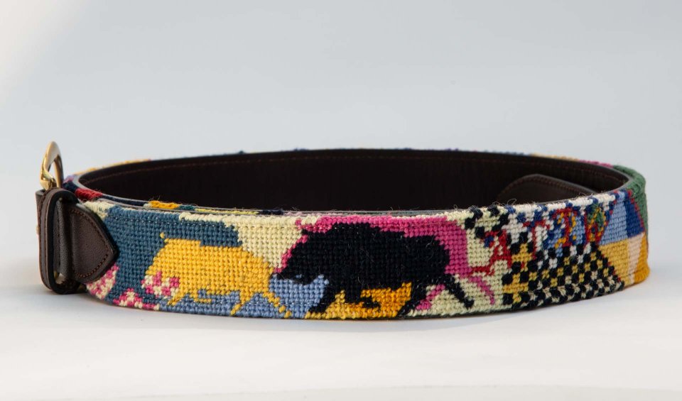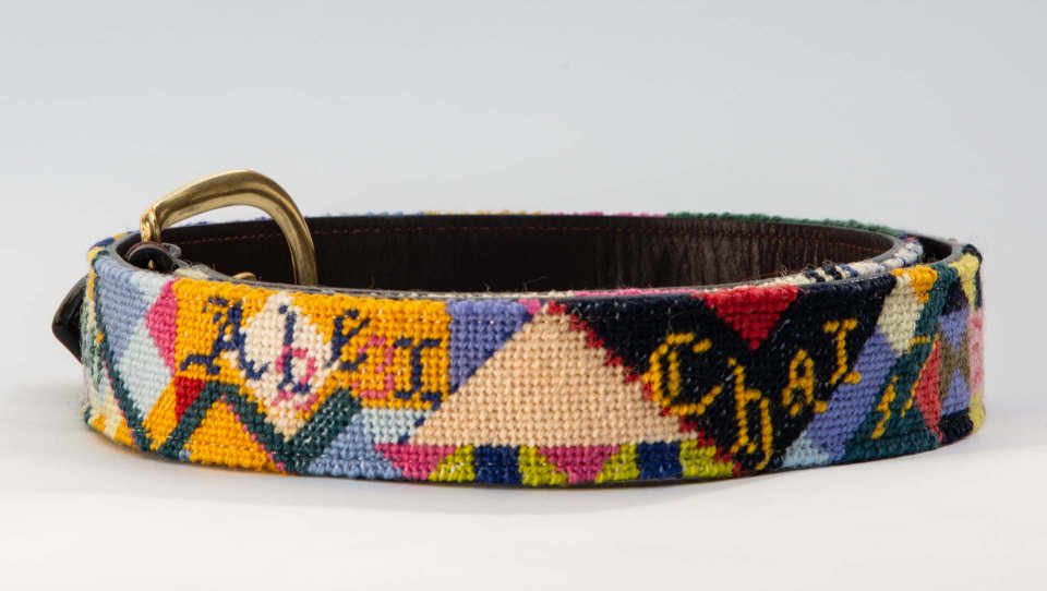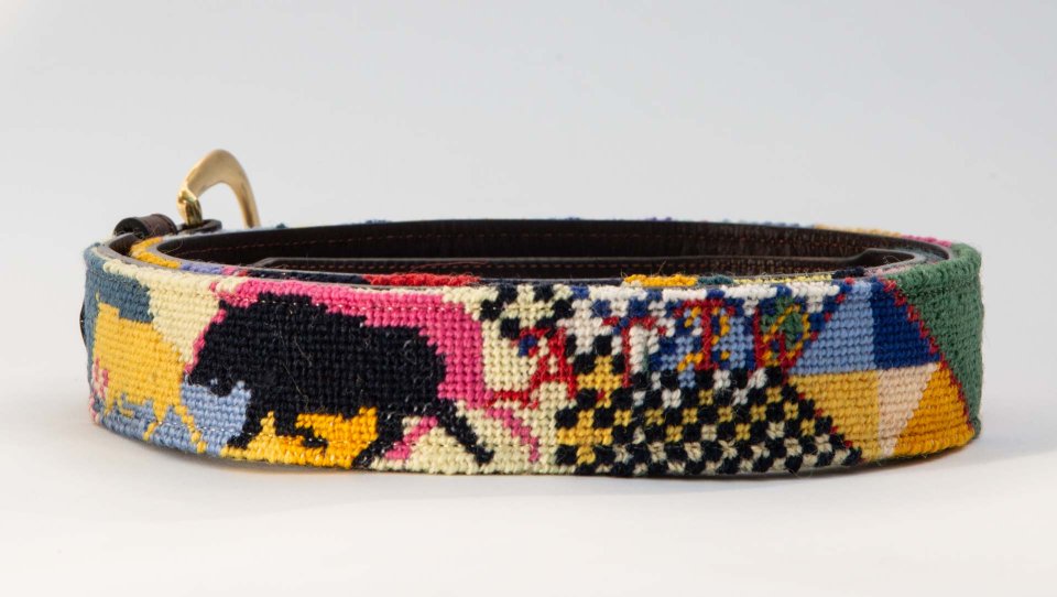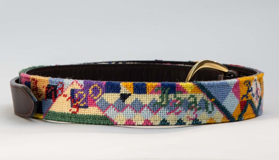 I stitch needlepoint belts and book weights in geometric, free-form designs. Each piece evolves spontaneously as the work progresses, with little preconceived planning. However, if a project is designed specifically for someone, I personalize the needlework with symbols and patterns associated with the client. The textile artist, Delores Dembus Bittleman, described her weaving method as ” the fibers show you the way”, which is how I proceed, by stitching through the canvas, I form connected shapes and lines along the length of a functional object.